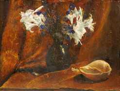 Vaso con gigli bianchi, iris e conchiglia Vase white lilies, iris and shell 1942, olio su cartone / oil on cardboard cm 51x65,5 ![]() |