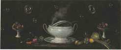 Zuppiera, ortaggi e bolle di sapone Tureen, vegetables and soap bubbles 1950, tempera grassa su masonite e lana / tempera grassa on masonite and wool cm 52x123 ![]() |